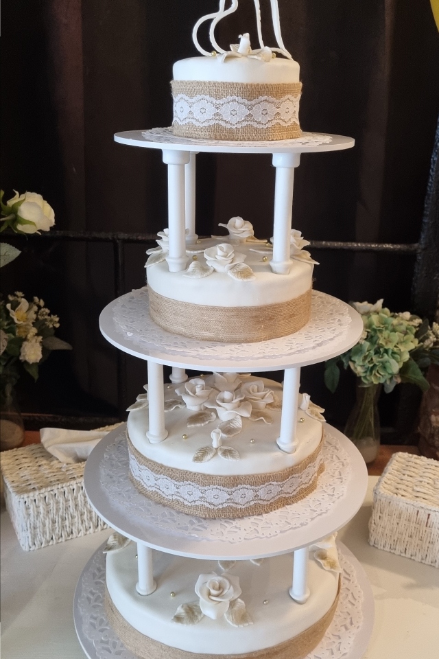 kunnen gestapeld worden of elk deel afzonderlijk op een bruidsstandaard. Vulling, kleur en opmaak in overleg.