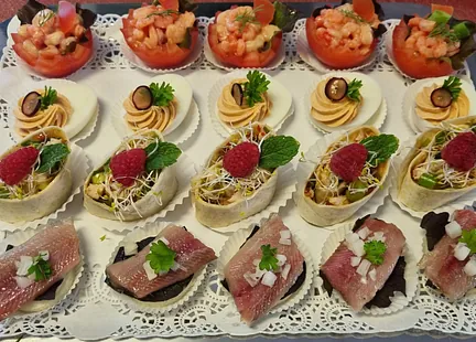 Pinchos zoals in Spanje met o.a tortilla, belegde stukjes stokbrood Beleg zoals bv: hamburgertje, zalm, tonijnsalade-chorizo, sardientjes en meer.