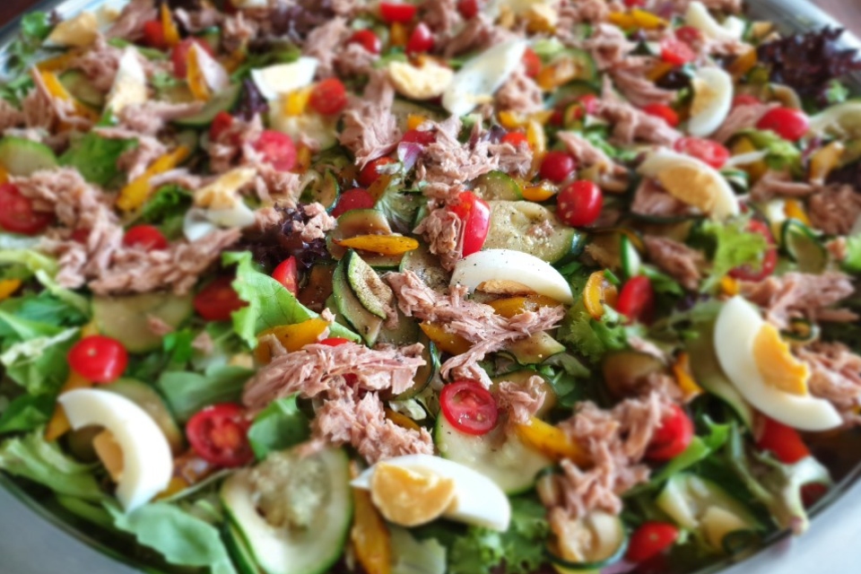 Rauwkostsalade gerookte kip of tonijn € 4,50 p/p.