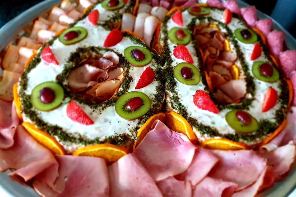 Opgemaakt met diverse vleeswaren en vers fruit