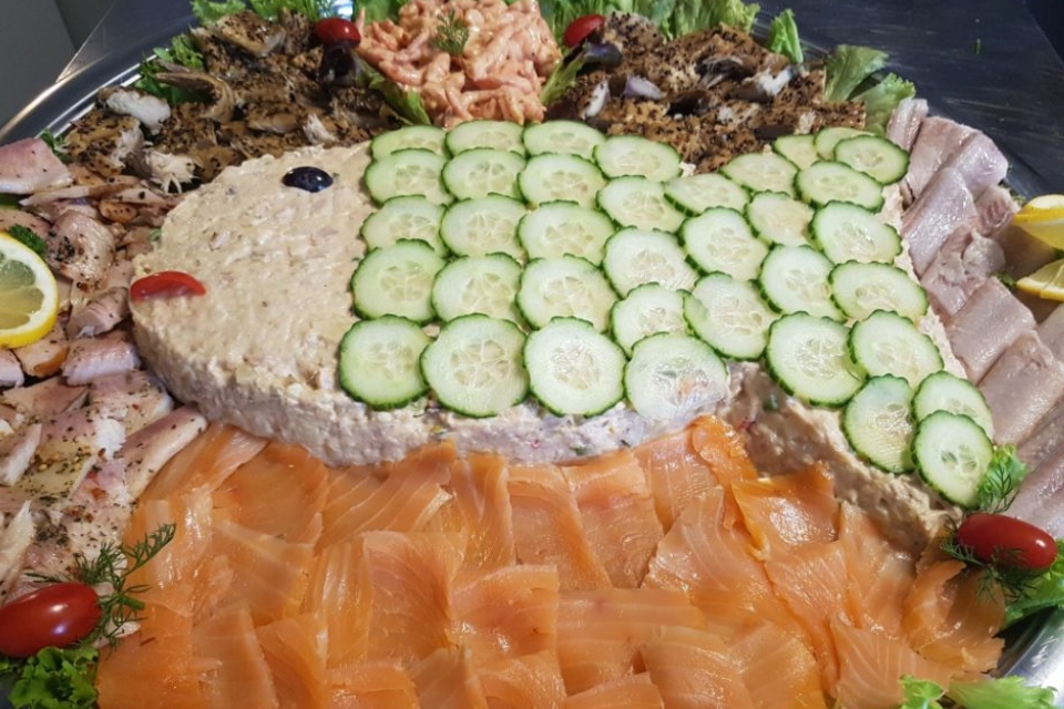 Opgemaakt met diverse vissoorten zoals gerookte zalm, garnalen, forelfilet